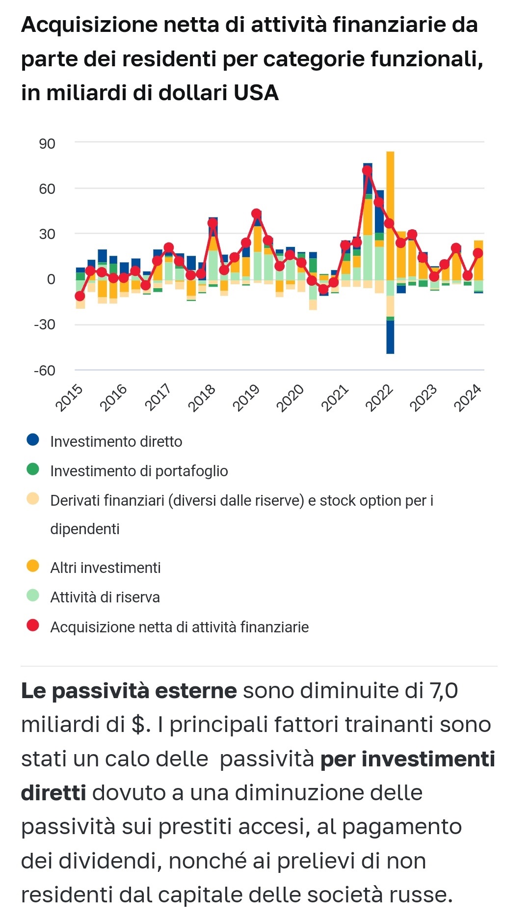 Come si evince dai fatti, la situazione economica della Russia non è tutta rose e fiori come l’informazione “alternativa” propaganda. Innanzitutto si registra un calo delle importazioni dovuto a “restrizioni sistemiche” il che fa riferimento alle sanzioni, le quali (ci si arriva anche per logica) non danneggiano solo l’Europa, ma anche la Russia stessa. Successivamente, si parla di una crescita delle attività finanziarie, le quali però, per contro, hanno determinato una diminuzione di altre attività “funzionali”. Bene, dopo vedremo quali. Di seguito però viene il bello. Perché non è forse vero che proprio in tempi recenti, alcuni propagandisti pro Putin hanno scritto che “La posizione della Russia sul piano economico-patrimoniale all’estero sta calando perché Putin sta tagliando tutti i ponti con l’Occidente?”