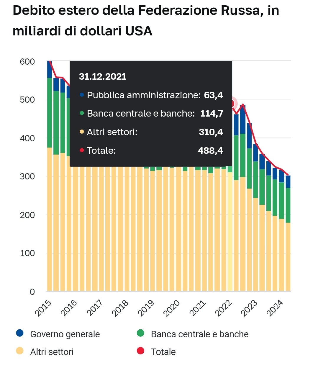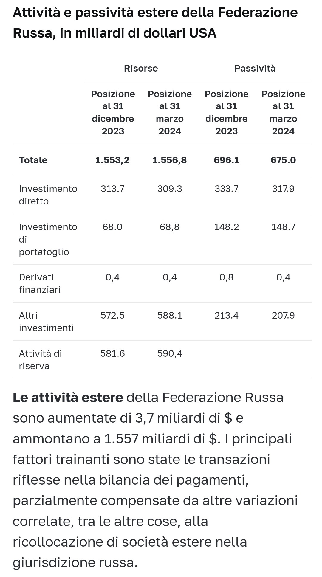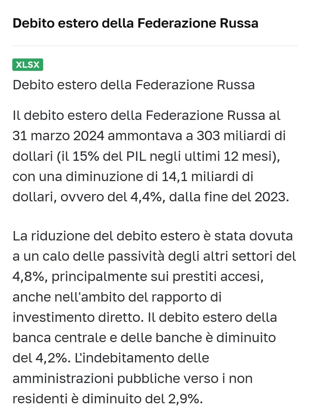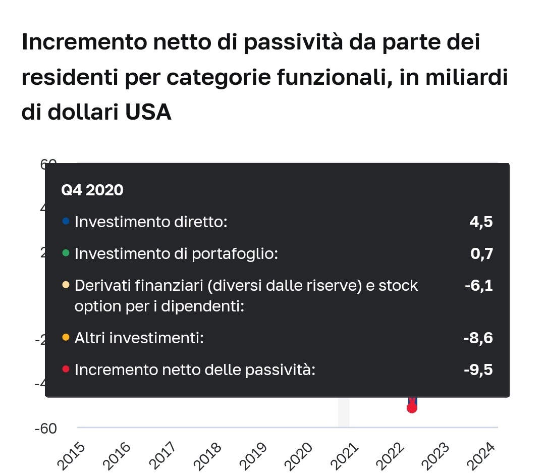 Bene, è aumentata da 857 a 882 miliardi di dollari. Dollari. Poi vediamo perché i dollari (alla faccia della dedolarizzazione).Poi si parla invece, di una leggera diminuzione del debito dovuto a cosa?