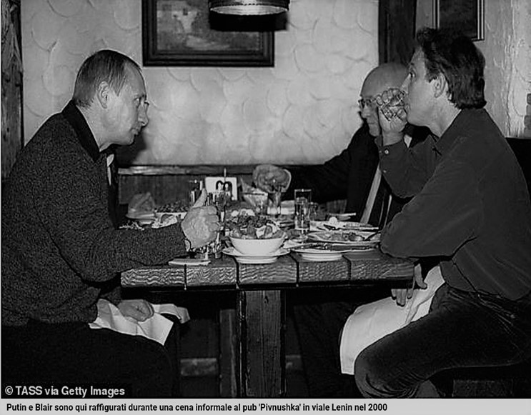 Vladimir Putin è stato insediato come presidente della Federazione Russa da Richard Dearlove, ex direttore dell’MI6 dal 1999 al 2004, il quale ha confermato più volte la decisione dei servizi segreti in collaborazione con la Chatham House, ossia il Royal Institute of International Affair britannico, organo sovranazionale tra i più potenti del mondo fondato nel 1920 sempre per volere della cricca. Si precisa che le elezioni presidenziali del 2000 si svolsero il 26 marzo e Putin vinse alla prima tornata e giurò come presidente il 7 maggio del 2000 (curioso e “casuale” come solo un anno dopo, nel 2001, furono creati i BRICS – Goldman Sachs). Ad ulteriore conferma di quanto esposto sopra, nell’immagine sottostante a sinistra Putin, Tony Blair e il direttore dell’MI6 Dearlove, cioè colui che ha insediato il primo al Cremlino, vengono ritratti insieme poco prima delle elezioni. Nell’immagine successiva, il Sunday Times del 23 giugno del 2023 dove L’MI6 rilascia un comunicato dove finge pentimento per aver aiutato (ennesima ammissione) Putin ad insediarsi al Cremlino. Si è detto finto pentimento poichè il presidente russo a tutt’oggi è in stretto contatto con l’MI6 e vedremo tra poco il motivo.