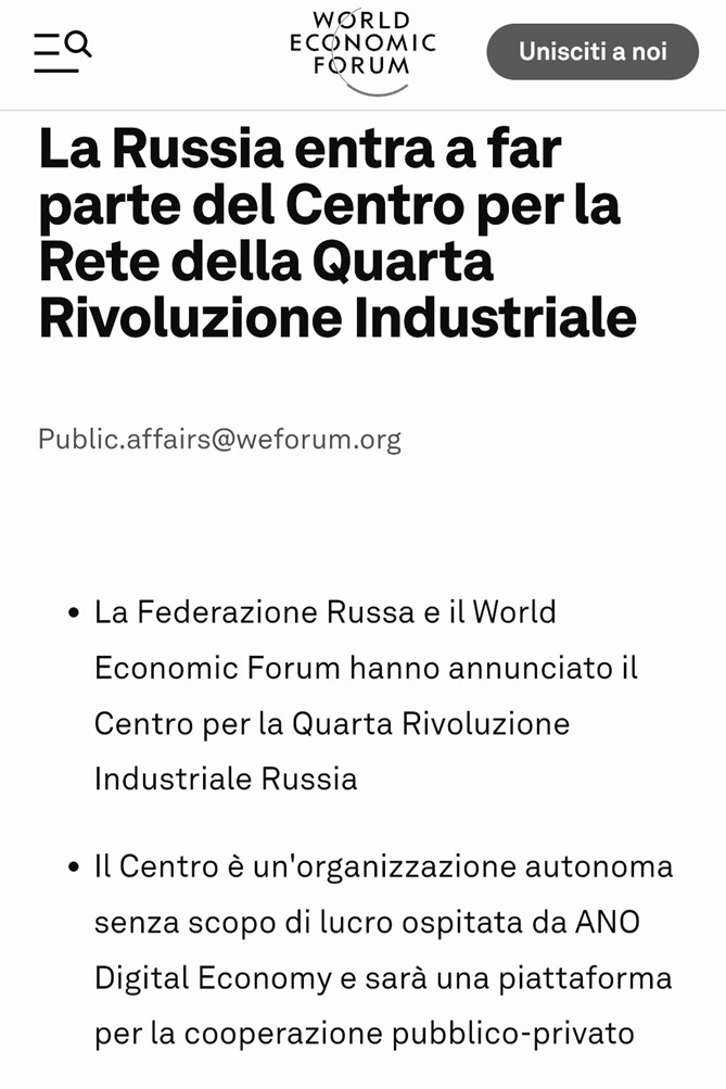 Klaus Schwab ha designato la Russia come polo centrale della nuova rivoluzione industriale nel suo libro intitolato “Governare la Quarta Rivoluzione industriale” e non è un caso che il 13 ottobre 2021 la Russia e il World Economic Forum hanno annunciato il Centro per la Quarta Rivoluzione Industriale in Russia. Il presidente del World Economic Forum, Børge Brende e il vice primo ministro della Russia, Dmitry Chernyshenko, a nome del governo russo hanno firmato un vero e proprio accordo. Lo trovate a questo link: