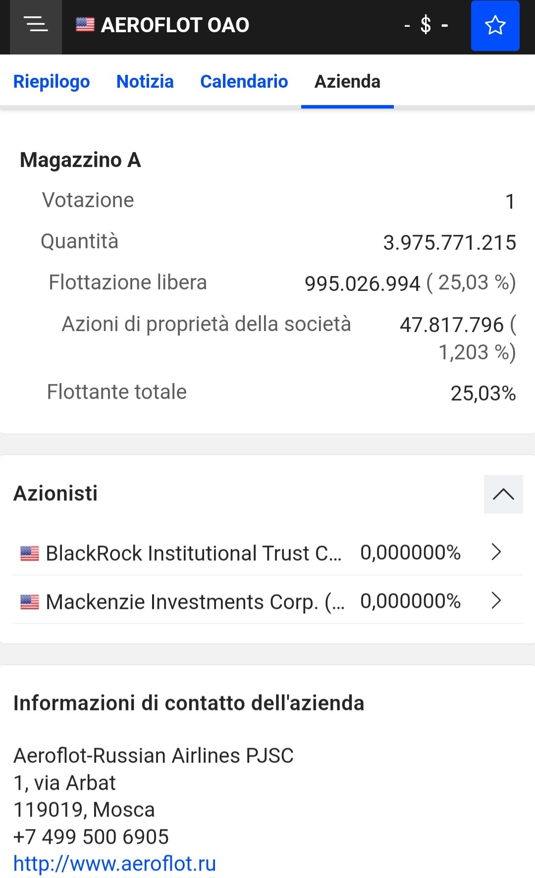 Adesso, perchè non dare un’occhiata alla Aeroflot, una delle più grandi compagnie aree russe? Per chi non lo sapesse, è di proprietà statunitense. Nell’immagine a destra potete leggere chi sono gli azionisti. Sono due.