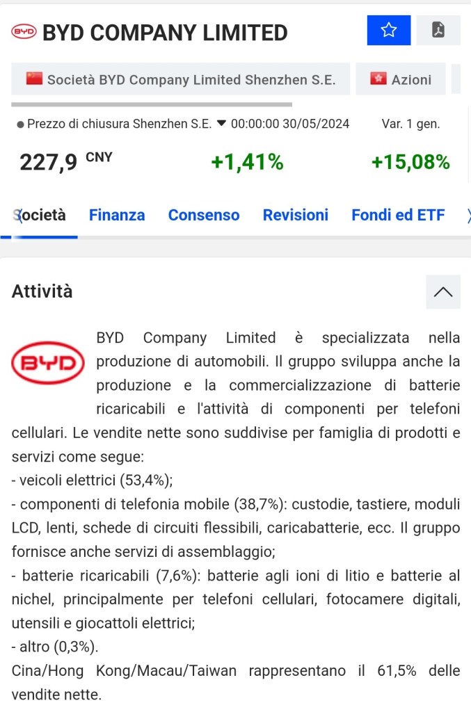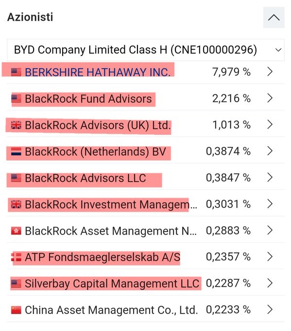 A tutto questo vorrei aggiungere un particolare davvero singolare. Si parla spesso di auto elettriche cinesi, ma di chi sono in realtà queste automobili? Iniziamo da una delle più grandi, la BYD Company Limited.