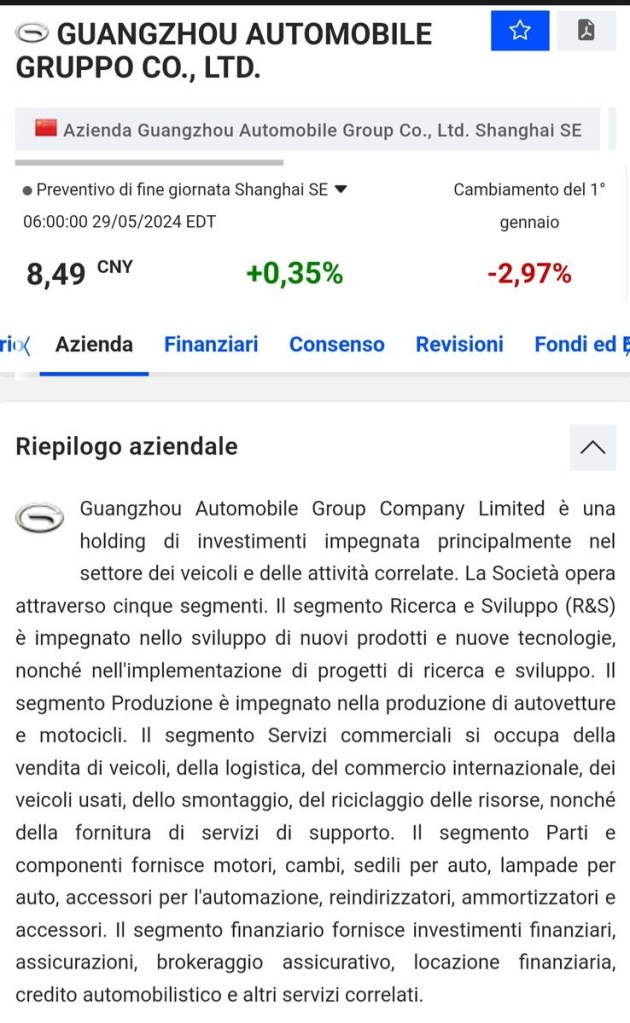 Si segnala che la BYD è stata fondata nel 1995 con sede a Shenzhen e nel centro di Los Angeles, era già la prima azienda globale per vendite con 1,85 milioni di veicoli elettrici e ibridi nel 2022, con un aumento del 211% su base annua al 2024, superando persino Tesla. Nelle Slide successive, abbiamo la Guangzhou Automobile Group Motor Co., Ltd (o GAC Motor, una Holding gigantesca che si occupa, fra l’altro, di veicoli elettrici e racchiude al suo interno altre società impegnate nei medesimi campi.