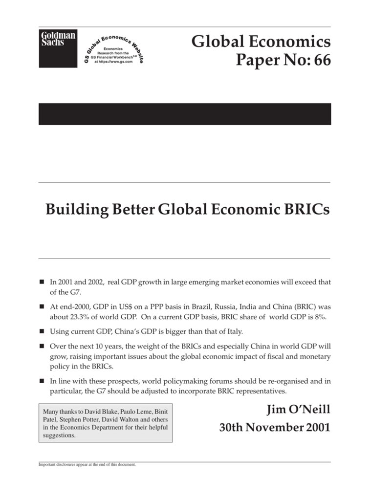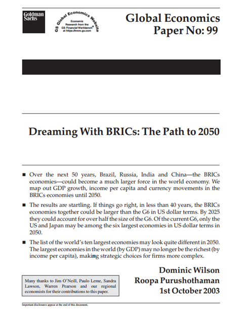 Tornando a noi, nel 2001, Jim O’Neill era il presidente della Goldman Sachs Asset. Quindi, dirigeva le strategie economiche e finanziarie della banca. Sotto la sua direzione, nel 2001, la Goldman Sachs pubblicò un documento intitolato “Building Better Global Economic BRICS” coniando così un nuovo acronimo come termine di investimento.