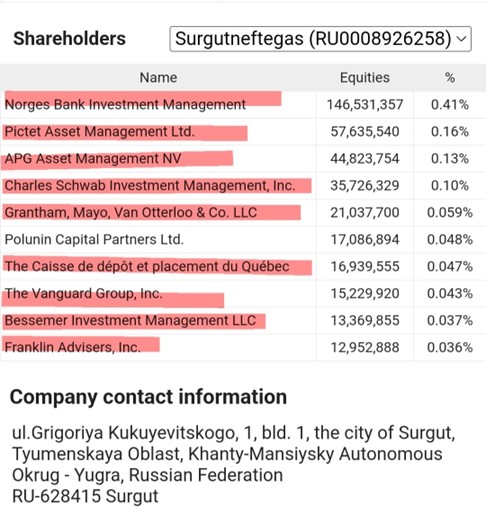 Si potrebbe andare avanti per giorni, ma ritengo quanto esposto un esempio esaustivo al fine di comprovare come le corporations cinesi, pontificate come meri colossi che si oppongono al dominio occidentale, non siano altro che l’altra faccia della medaglia dello stesso potere che muove il mondo: gli usurai ai vertici delle banche centrali, i quali sono gli stessi al comando delle banche private, dei grandi fondi di investimento e delle multinazionali. Ora passiamo alla Russia. Gazprom su tutte, visti i recenti “eventi” relativi al gas ecc. A chi appartiene la Gazprom? A fianco, la Surgutneftegas (compagnia petrolifera e di gas, proprietaria di grandi riserve di petrolio e gas nella Siberia occidentale).