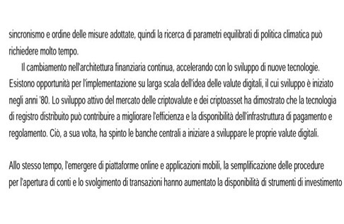 Ma ancora più di rilievo è il fatto che Il 18/05/2023 la banca centrale russa ha pubblicato un rapporto intitolato “Nuove sfide per la politica monetaria”. In questo documento, la banca centrale, oltre alle CBDC, mette in evidenza la necessità di attuare misure funzionali alla limitazione del riscaldamento globale poiché il cambiamento climatico si sta facendo sempre più pressante.