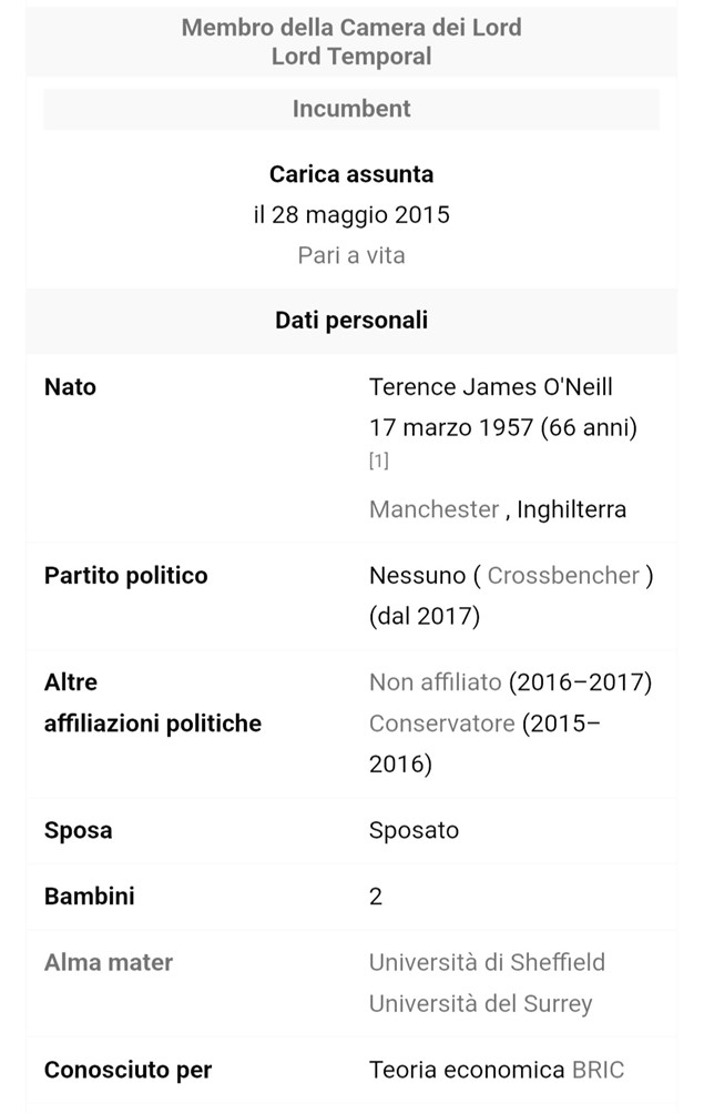 Dopo un processo durato oltre cinquant’anni, l’ uomo che sulla base degli schemi appena esposti ha creato i BRICS si chiama Jim O’Neill. Per i più questo nome risulta sconosciuto, ma è fondamentale capire di chi stiamo parlando per arrivare al nocciolo della questione. Sir Jim O ‘Neil ha conseguito due lauree BA e MA in economia presso la Sheffield University nel 1978 e un dottorato di ricerca presso l’Università del Surrey nel 1982. Ha ricevuto quattro lauree honoris causa: una dall’Institute of Education; due dalla University of London per la sua filantropia e per i suoi servizi al settore bancario e finanziario; Sheffield University in riconoscimento del suo contributo all’economia internazionale.