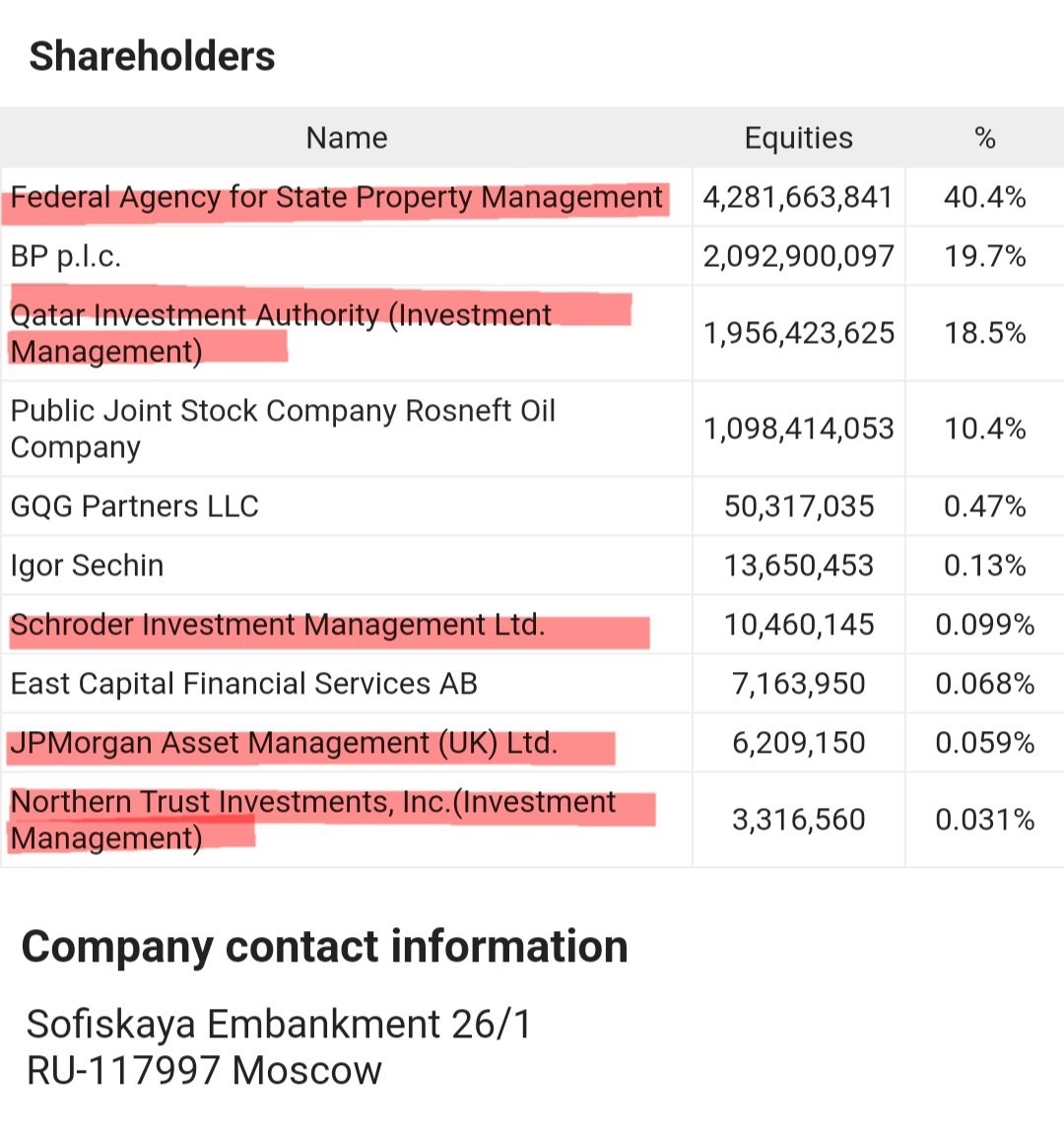 Attenzione, nel 2015, quando il compito della Goldman Sachs fu esaurito, chiuse il suo fondo all’interno del “BRICS” (ma potenziò la sua presenza all’interno delle nazioni dei suoi paesi con investimenti e altre operazioni finanziarie). O’Neill, specie, durante i tre anni come presidente del RIIA ha incentivato e spinto continui flussi di capitali verso i BRICS da parte dei grandi banchieri internazionali ai vertici delle banche centrali, private e dei fondi di investimento. Ciò è ben comprovato anche dagli azionariati delle più grandi corporations dei paesi BRICS, in mano all’alta finanza angloamericana. A questo proposito si vuole stilare una lista degli azionariati di alcune delle più grandi corporations di alcuni dei paesi BRICS, prendendo in esame i più importanti, ossia Cina e Russia.