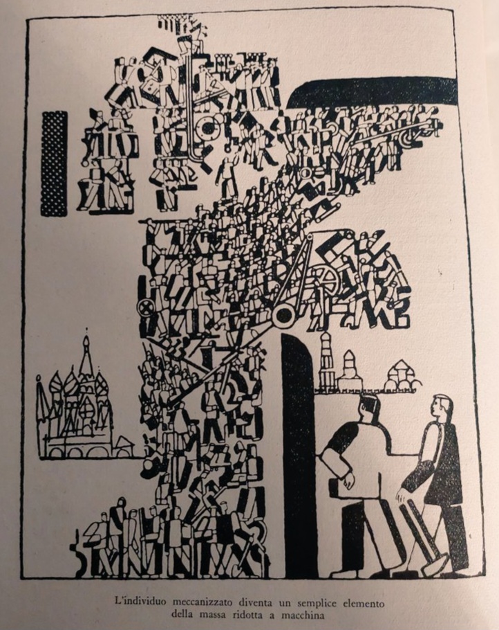 «Con l’esasperazione dei fanatici, i bolscevichi condannano tutti coloro che vogliono introdurre di soppiatto una psiche nell’uomo collettivo a costruzione meccanica per deporre in lui sin d’ora il germe di decomposizione a cui si riduce in fondo ogni specie di psiche. L’uomo collettivo non deve diventare un organismo psichico: le basi su cui sorgerà l’umanità meccanizzata non rappresentano momenti spirituali, ma soltanto l’unione materiale di molti per costituire un apparecchio comune di lavoro e di produzione. Con non minore severità viene respinta, come sospetta di significati controrivoluzionari, l’opinione che l’uomo-massa abbia il carattere di un organismo biologico. Il dividuo organizzato, meta suprema a cui tende la società comunista priva di classi, avrà un unico contrassegno organico: lo scheletro, che fornirà lo strumento di lavoro; secondo afferma Bucharin, i rapporti di produzione costituiranno l’ossatura di tutto il corpo sociale. Ma non è tutto: alcuni bolscevichi, ai quali la grazia della concezione materialistica delle leggi naturali ha donato l’attitudine alle profezie scientifiche, già vedono e annunciano l’era, in cui, con il progressivo meccanizzarsi di tutte le manifestazioni di vita, anche gli ultimi resti umani di ogni elemento organico spariranno, sostituiti da meccanismi. Allora anche « lo scheletro dei rapporti produttivi si trasformerà finalmente negli elementi di un gigantesco e fidato automa, uomo collettivo ideale.»