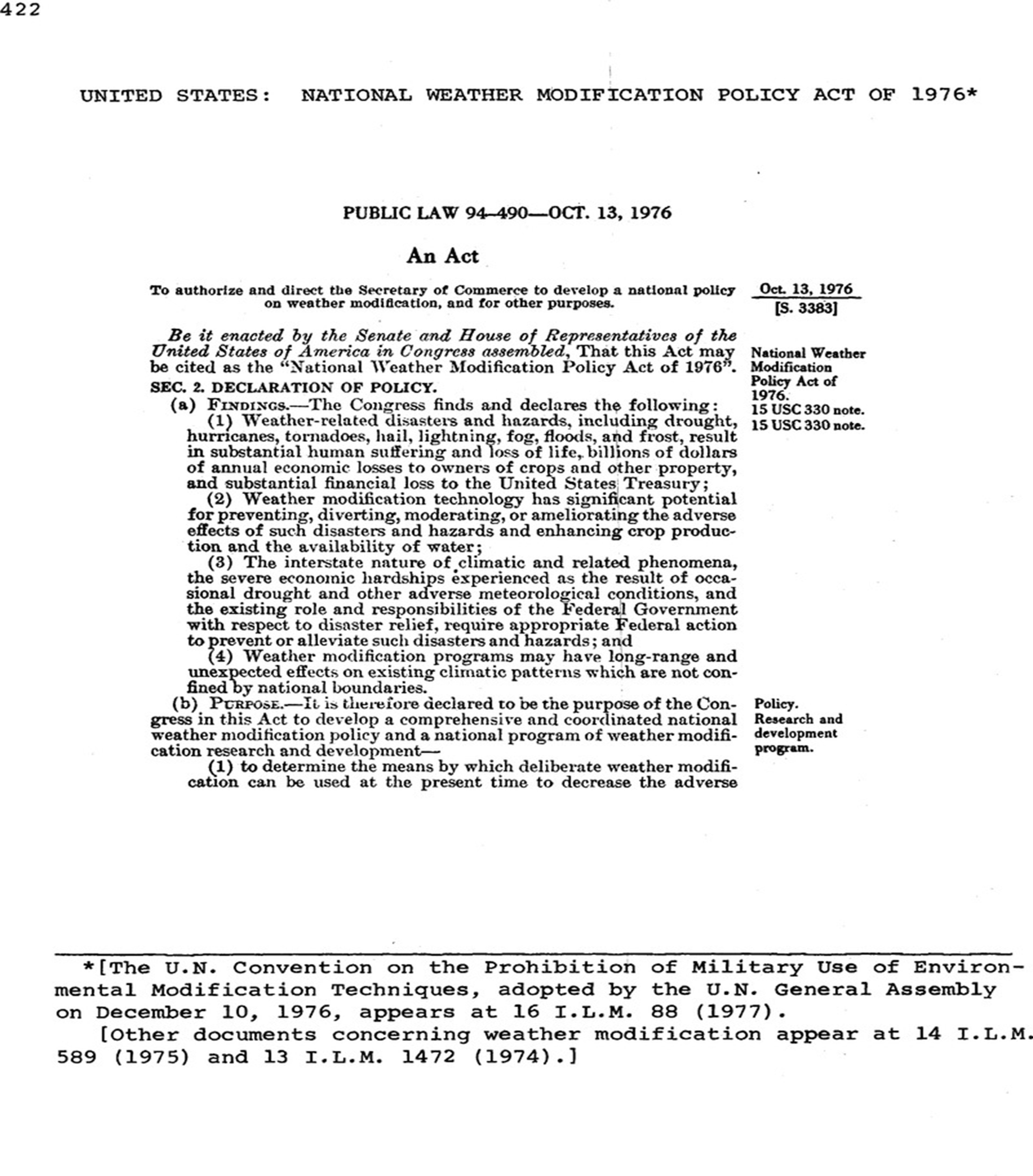 Nel 1976, il Congresso degli Stati Uniti (sotto il controllo del CFR) varò il National Weather Modification Act. Sempre il congresso ordinò a Juanita Kreps, l’allora Segretario al Commercio, di formulare un piano di politica nazionale completa e un programma di ricerca globale sul clima ove coinvolgere anche gli altri paesi del mondo. Poiché gli esperimenti condotti fino a quel momento avevano portato gli addetti ai lavori a risultati straordinari sul piano del controllo meteorologico, nel gennaio del 1977, la Kreps istituì il Weather Modification Advisory Board, un gruppo di cittadini di 17 membri a cui venne affidato il compito di studiare lo stato della tecnologia di modifica del tempo, sviluppare nuove politiche nazionali e programmi di ricerca per il controllo meteorologico.