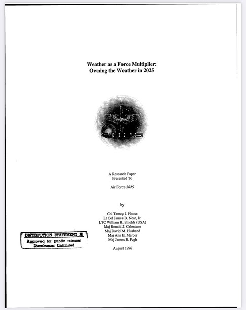 Qualcuno potrà non crederci, ma è un fatto che gli Stati Uniti, nel 1996 hanno divulgato documento militare denominato “Weather as a Force Multiplier: Owning the Weather in 2025” (Il meteo come moltiplicatore di forza: Possedere il clima entro il 2025) disponibile in PDF all’indirizzo ufficiale della Defense Technical Information Center americana a questo indirizzo: