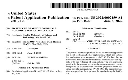 Tale invenzione: “offre una particella nucleante di ghiaccio per l’inseminazione delle nuvole e altre applicazioni, in grado di avviare la nucleazione del ghiaccio a una temperatura di – 8 gradi C. Inoltre, il numero di particelle nucleanti di ghiaccio aumenta continuamente e rapidamente con la riduzione della temperatura. La particella di nucleazione del ghiaccio della presente invenzione è un composito poroso nano strutturato di ossido di grafene ridotto a tre dimensioni e nanoparticelle di biossido di silice (PrGO – SN). La presente invenzione prevede anche un processo di sintesi del PrGO – SN.”