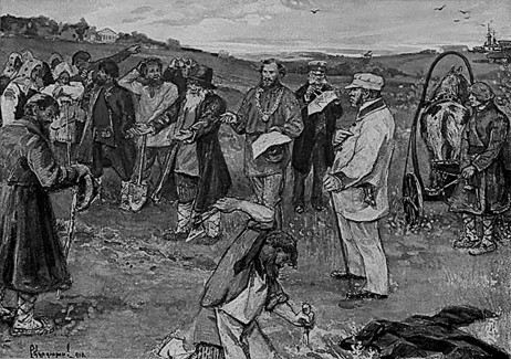 All’epoca vi erano i MIR, cioè le comunità agrarie russe di origine medievale nelle quali i contadini erano usufruttuari in comune della terra che lavoravano. Sempre Tarquini scrive che: