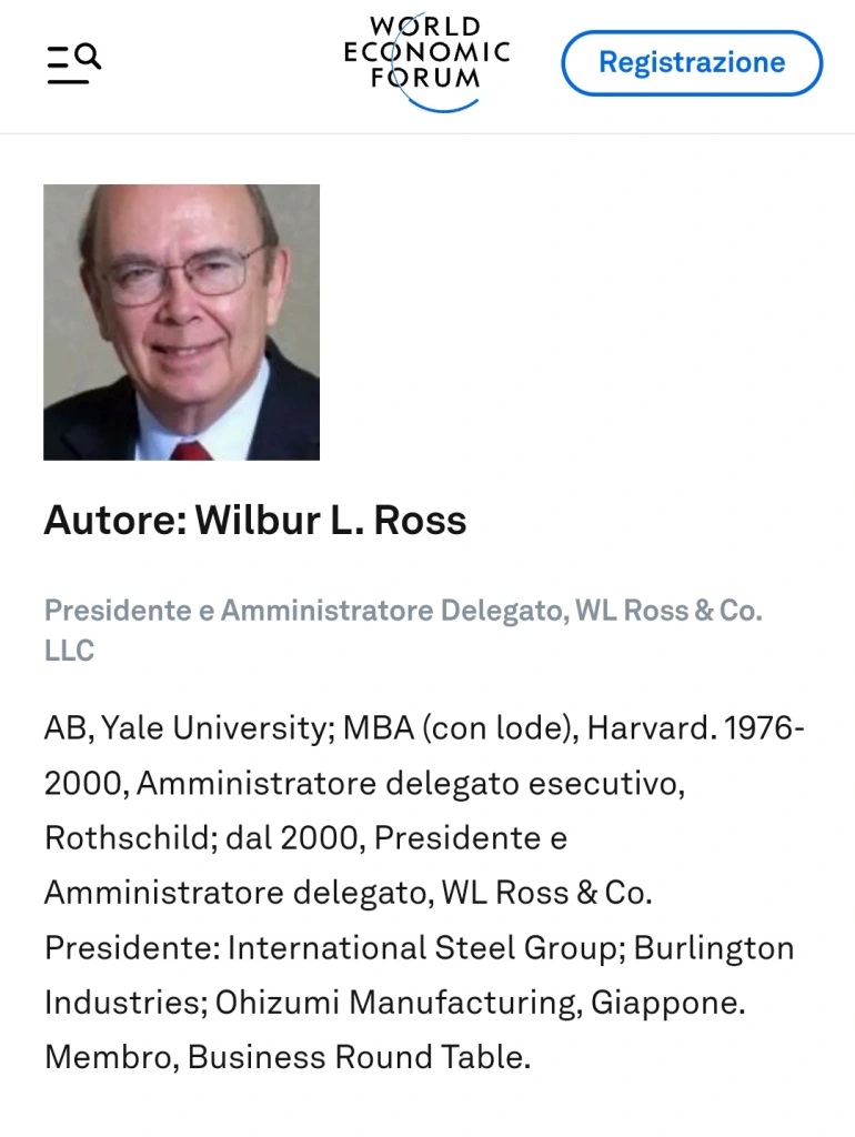 Tornando a noi, indipendentemente dalle circostanze, sempre rifacendoci al discorso Atlantic City, Trump continuò a cavalcare l’onda del “vincitore”, che lui era una vittima del sistema (come sta facendo adesso) che gli era avverso, che tutti gli altri erano invidiosi perché erano dei perdenti e fine della storia. Ma è proprio in questo momento storico che Trump diventa a tutti gli effetti un agente dei Rothschild attraverso un loro fedele soldato, il signor Wilbur Louis Ross, membro del World Economic Forum, banchiere, famoso per aver acquisito e ristrutturato società fallite in settori come l’acciaio, il carbone, le telecomunicazioni e il tessile, rivendendole in seguito a scopo di lucro dopo che le operazioni erano ovviamente migliorate, il che gli consentì di stabilire un record che gli valse il soprannome di “Re del fallimento”.