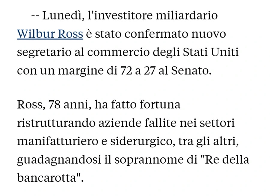 Solo per citare un dato, il signor Ross è stato presidente o amministratore delegato di oltre 100 società operanti in più di 20 paesi, ed è stato nominato da Bloomberg Markets come una delle 50 persone più influenti nella finanza globale. Inoltre, ha militato sia nel partito Democratico prima e poi quello Repubblicano dopo. Ma c’è di più, perché Wilbur Ross è stato anche il Segretario al Commercio durante l’amministrazione Trump.