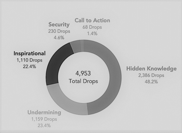 «I drop spesso arrivavano in post raggruppati e il significato di questi era spesso chiaro solo nel contesto di altri drop contemporanei. Per aiutare a garantire l’affidabilità dell’analisi in questione, ci si è impegnati sia nell’uso di un libro di codici che nel test dell’affidabilità dell’intercodificatore. È stato sviluppato un libro di codici utilizzando definizioni chiaramente articolate e gocce di esempio sviluppate e identificate durante la codifica assiale. Per rispondere a RQ1, sono state identificate cinque categorie di messaggi all’interno dei drop di QAnon: allusione a conoscenza nascosta, ispirazione, indebolimento, invito all’azione e amministrazione. La figura 1 illustra la distribuzione relativa di queste categorie. In ordine di prevalenza, le categorie erano allusione alla conoscenza nascosta (n = 2.386, 48,2 percento), istituzioni e individui minanti (n = 1.159, 23,4 percento), ispirazione (n = 1.110, 22,4 percento), amministrazione e sicurezza (n = 230, 4,6 per cento), e call to action (n= 68, 1,4 per cento).