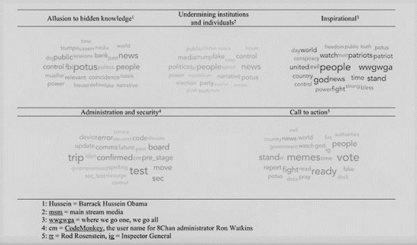 Risulta necessario evidenziare che i risultati finali dello studio (non l’unico sul fenomeno) fanno emergere diverse importanti implicazioni degne di nota. Innanzitutto, che la messaggistica di Q, nel corso del tempo, si è evoluta in modo decisamente anomalo. Nello specifico, quando Q è passato da 8chan a 8kun alla fine del 2019, i drop hanno iniziato a concentrarsi di più sui contenuti politici di destra e meno sul pensiero cospiratorio. La comunità di QAnon però è cresciuta grazie al pensiero cospiratorio e alle promesse inerenti la conoscenza nascosta, ma è stata de facto usata per altri scopi di natura politica. Ufficialmente, al centro della messaggistica di Q vi era il tentativo di minare istituzioni e individui all’interno di governi, società e media, al fine di favorire la parte da loro sostenuta. È importante visualizzare questo contenuto, o qualsiasi messaggio di Q, non isolatamente, ma insieme ad altri messaggi che hanno suggerito che la sfiducia nel governo e nelle istituzioni legislative spesso funge da fattore di spinta e che influenza la formazione e la diffusione delle teorie del complotto.