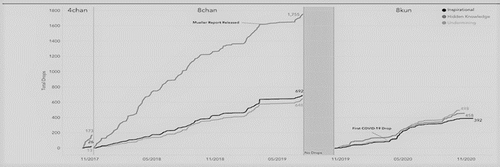 La Figura sottostante mostra un chiaro cambiamento nel comportamento quando i messaggi di Q sono passati da 8chan a 8kun nel novembre 2019. Mentre la sicurezza e l’invito all’azione (non presenti nella figura) continuano a livelli di attività piuttosto bassi, le altre tre categorie si spostano per diventare più uniformemente distribuite. Nel 2017 le perdite di conoscenza nascosta hanno rappresentato il 66,0% dei post, mentre nel 2020 hanno rappresentato solo il 30,9%. La differenza è stata spiegata da una percentuale maggiore di cadute di indebolimento e ispirazione. Queste categorie hanno rappresentato rispettivamente il 37,7% e il 29,5% dei cali del 2020. In breve, Q passa da un focus specifico sulla diffusione della teoria del complotto a un focus sulla costruzione di un movimento sociale. Questo cambiamento è avvenuto un anno prima delle elezioni statunitensi del 2020.