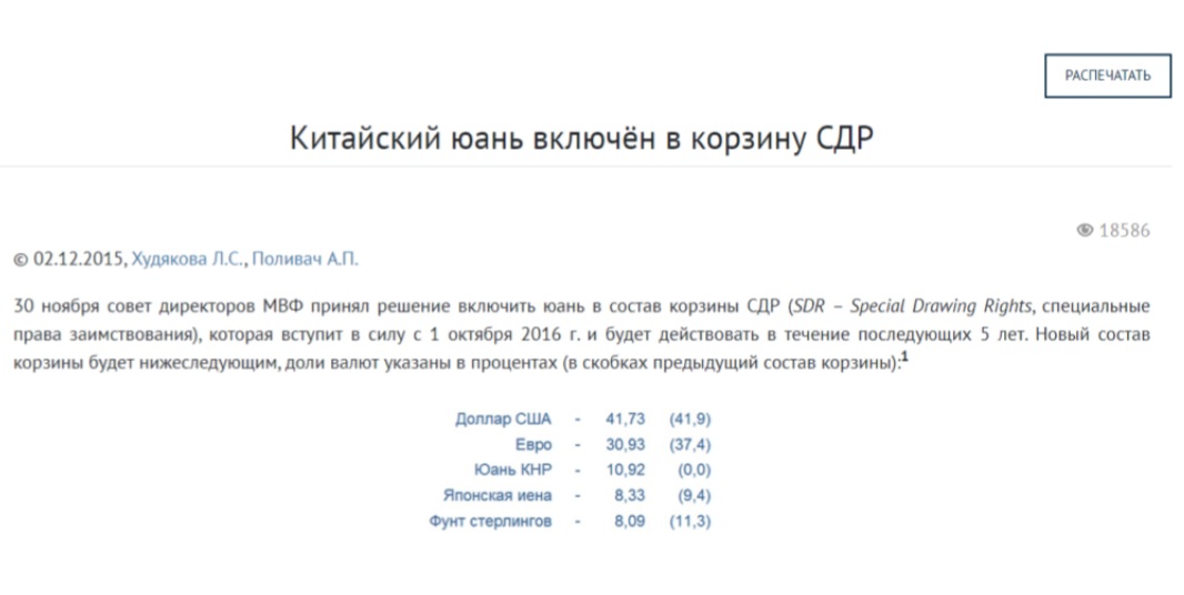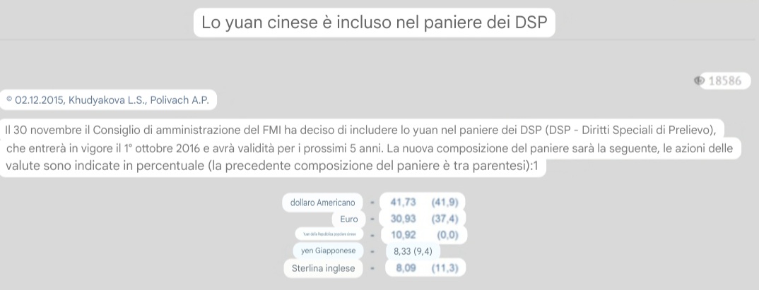 L’inclusione della Cina nel paniere dei DSP nel 2015 è stata vista da alcuni media mainstream come di minore importanza, ma il capo del FMI Christine Lagarde ha definito il cambiamento come uno sviluppo importante non per la Cina ma per il FMI e i DSP, che lei definisce con orgoglio la “valuta delle valute”.