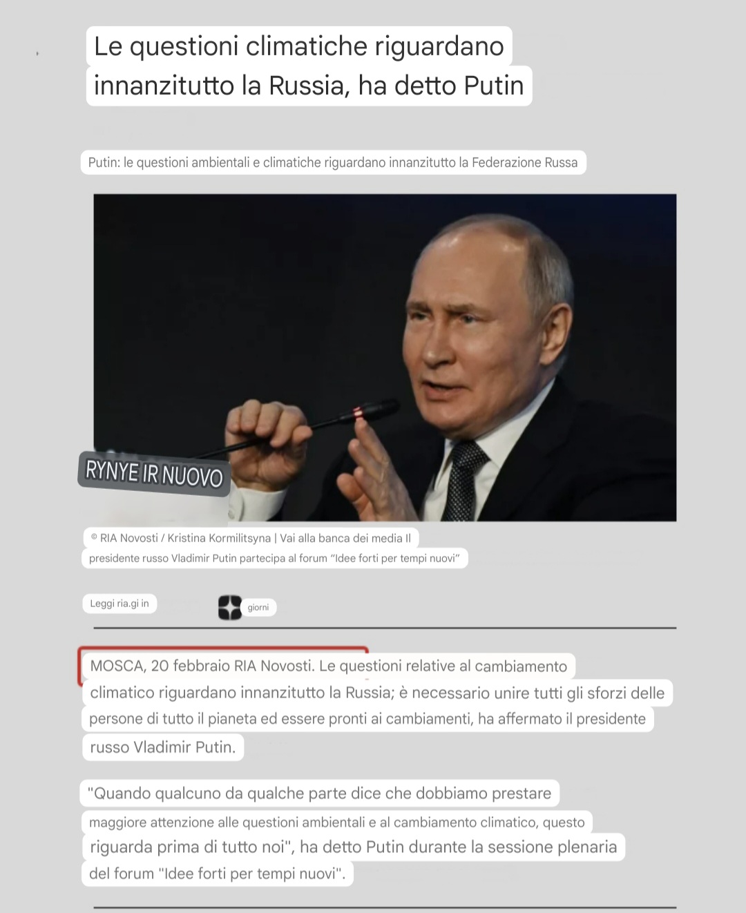 Questa è davvero una sfida globale. E sono fiducioso che l’umanità abbia il potenziale intellettuale necessario per rispondere. Dobbiamo unire le forze, innanzitutto, con quei paesi che hanno un forte potenziale di ricerca e hanno compiuto progressi significativi nella ricerca fondamentale. Proponiamo di convocare un forum speciale sotto gli auspici delle Nazioni Unite per affrontare in modo globale le questioni legate all’esaurimento delle risorse naturali, alla distruzione degli habitat e al cambiamento climatico. La Russia è pronta a co-organizzare un simile forum”.