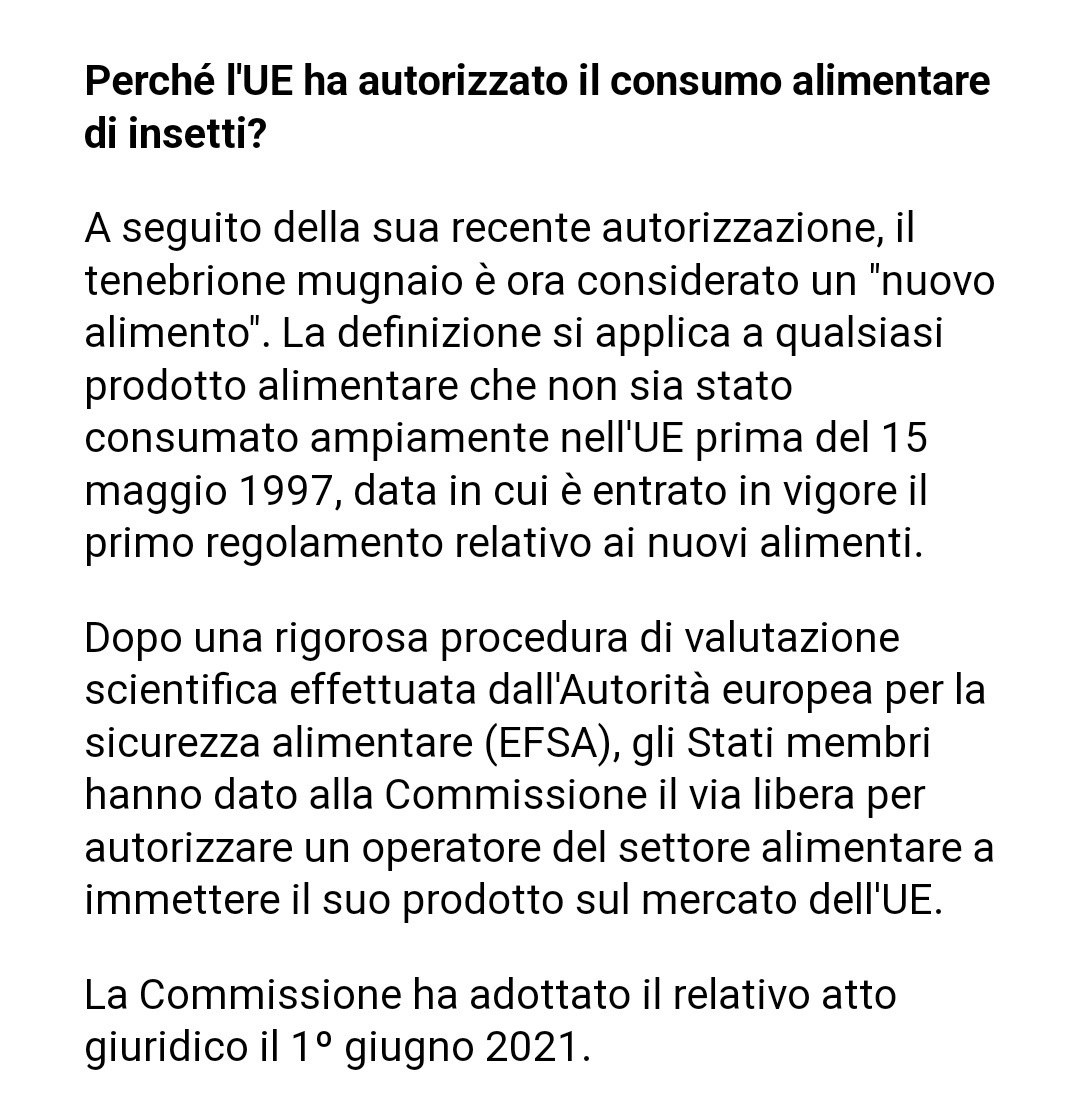 «A seguito della sua recente autorizzazione, il tenebrione mugnaio è ora considerato un nuovo alimento. La definizione si applica a qualsiasi prodotto alimentare che non sia stato consumato ampiamente nell’UE prima del 15 maggio 1997, data in cui è entrato in vigore il primo regolamento relativo ai nuovi alimenti. Dopo una rigorosa procedura di valutazione scientifica effettuata dall’Autorità europea per la sicurezza alimentare (EFSA), gli Stati membri hanno dato alla Commissione il via libera per autorizzare un operatore del settore alimentare a immettere il suo prodotto sul mercato dell’UE.»