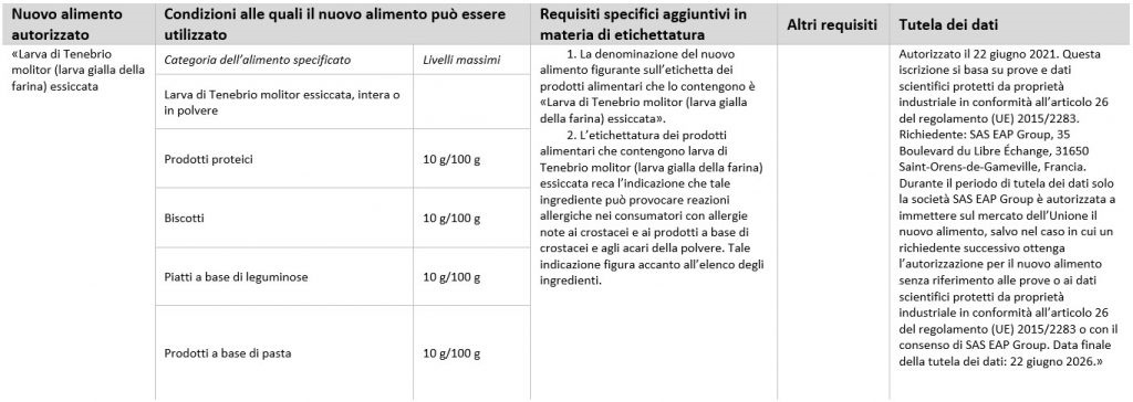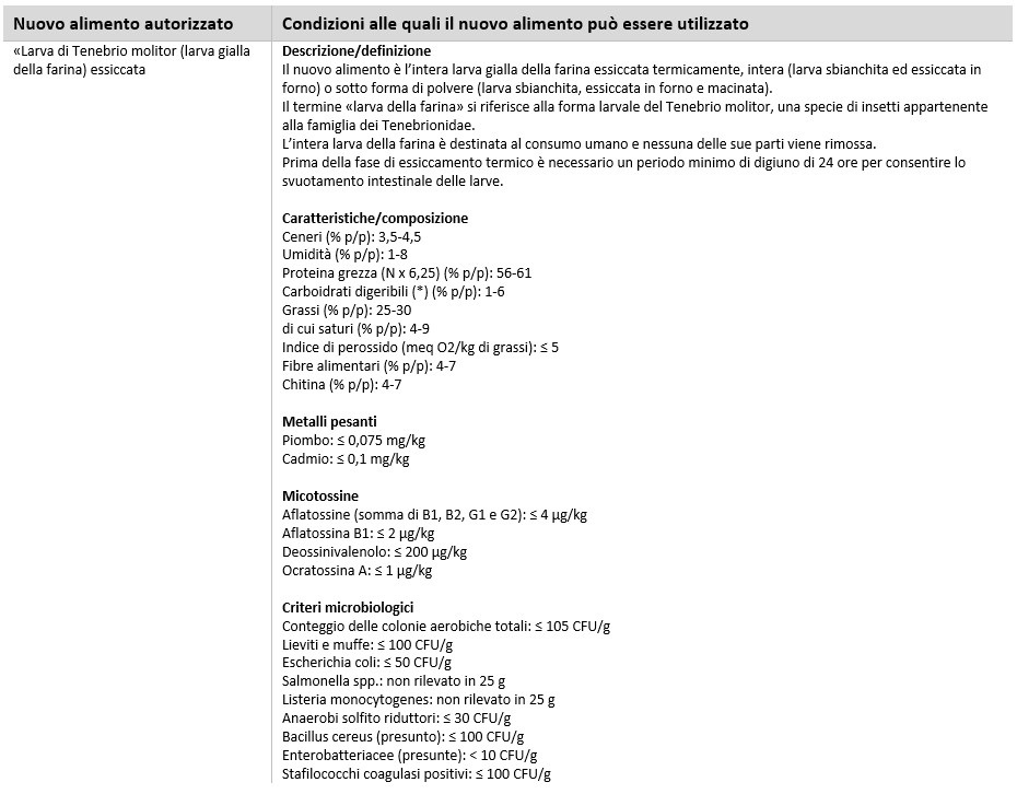 Si allega anche l’indirizzo dove potete trovare nello specifico le tabelle dove vengono descritte le condizioni alle quali il nuovo alimento (insetti) può essere utilizzato (categoria di alimento che può contenerlo e livelli massimi), i requisiti specifici aggiuntivi in materia di etichettatura e tutta un’altra serie di caratteristiche.