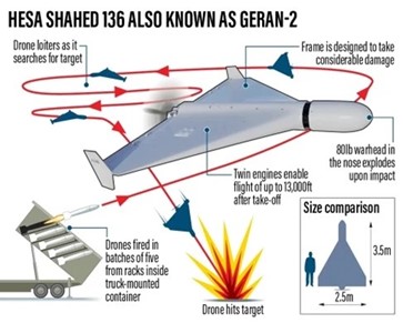 Si tratta di una “munizione circuitante” (un tipo di arma noto anche come “drone suicida”) progettata dall’azienda aeronautica iraniana Shahed e costruita dalla Iran Aircraft Manufacturing Industries Corporation (HESA) (8). In servizio dal 2021, quest’arma, nota anche con il nome russo Geran-2, è stata progettata per colpire bersagli a terra, eludendo le difese aeree, in un raggio di circa 2500 km dal sito di lancio.