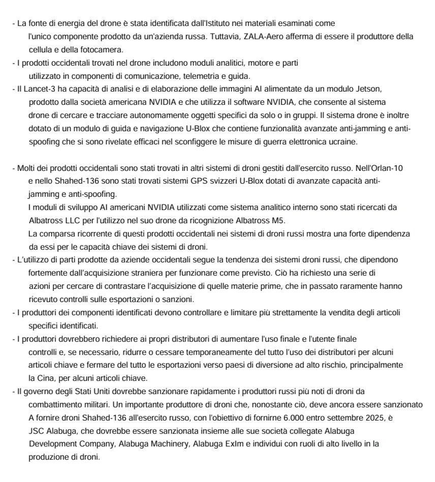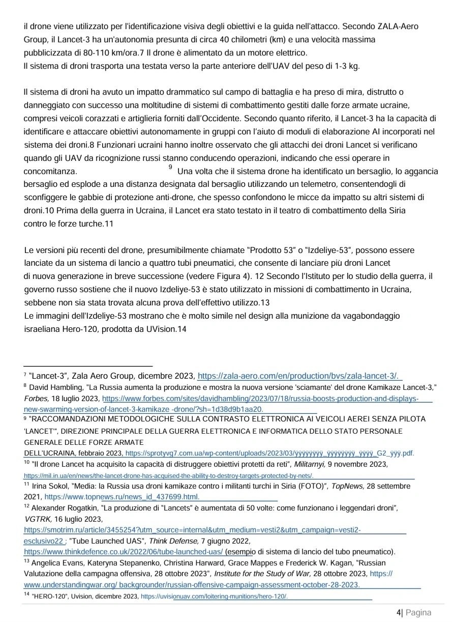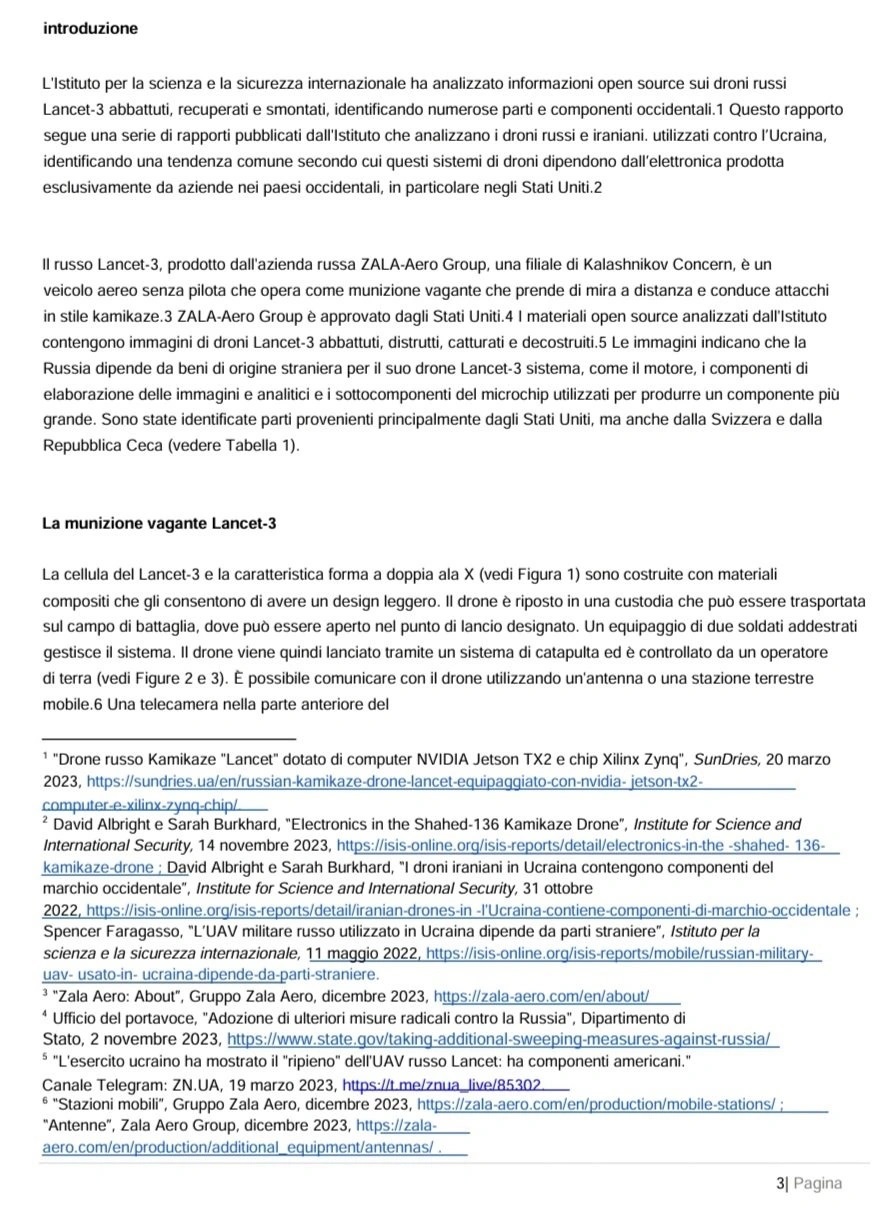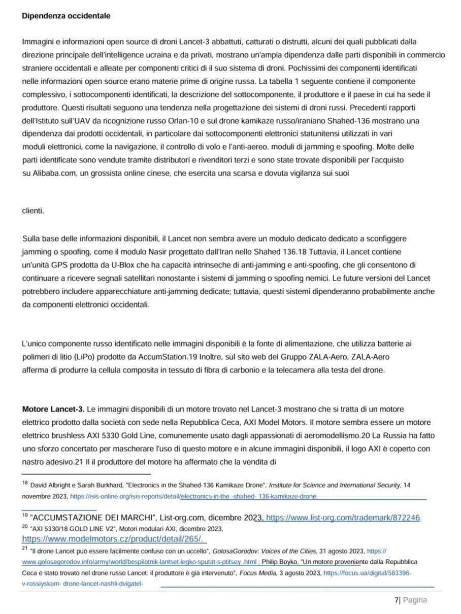 Sul rapporto si legge quanto segue: «La Russia fa sempre più affidamento su grandi quantità di veicoli aerei senza pilota (UAV) per identificare, colpire e attaccare posizioni, veicoli e strutture ucraine. La Russia ha una capacità limitata di progettare e produrre materie prime strategiche avanzate. Per costruire questi UAV, la Russia dipende da ampie reti di approvvigionamento occidentali per acquisire materie prime strategiche prodotte da paesi stranieri, in particolare dagli Stati Uniti…Il drone russo Lancet-3, prodotto da ZALA-Aero Group, contiene componenti chiave prodotte da aziende occidentali. Sono state identificate parti di aziende con sede principalmente negli Stati Uniti, in Svizzera e nella Repubblica Ceca… I componenti occidentali consentono al drone Lancet-3 di avere capacità di puntamento avanzate che altrimenti non avrebbe. Grazie ai componenti stranieri, i droni russi riescono a sconfiggere più efficacemente i sistemi di difesa ucraini… Le immagini disponibili di un motore trovato nel Lancet-3 mostrano che si tratta di un motore elettrico prodotto dalla società ceca AXI Model Motors, il brushless AXI 5330 Gold Line… La Russia ha compiuto uno sforzo concertato per mascherare l’uso di questo motore e in alcune immagini disponibili, il logo AXI è coperto con nastro adesivo il Lancet-3 ha capacità di intelligenza artificiale (IA) che consentono un’elaborazione avanzata di immagini e dati per l’acquisizione del bersaglio. Una decostruzione di un drone Lancet ha scoperto che è dotato del Jetson TX2, un modulo di sviluppo IA avanzato e compatto prodotto dalla società americana NVIDIA.» (22)