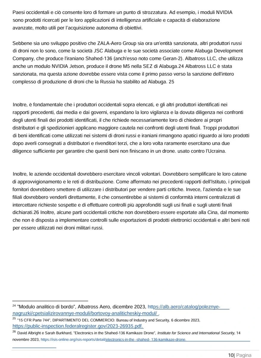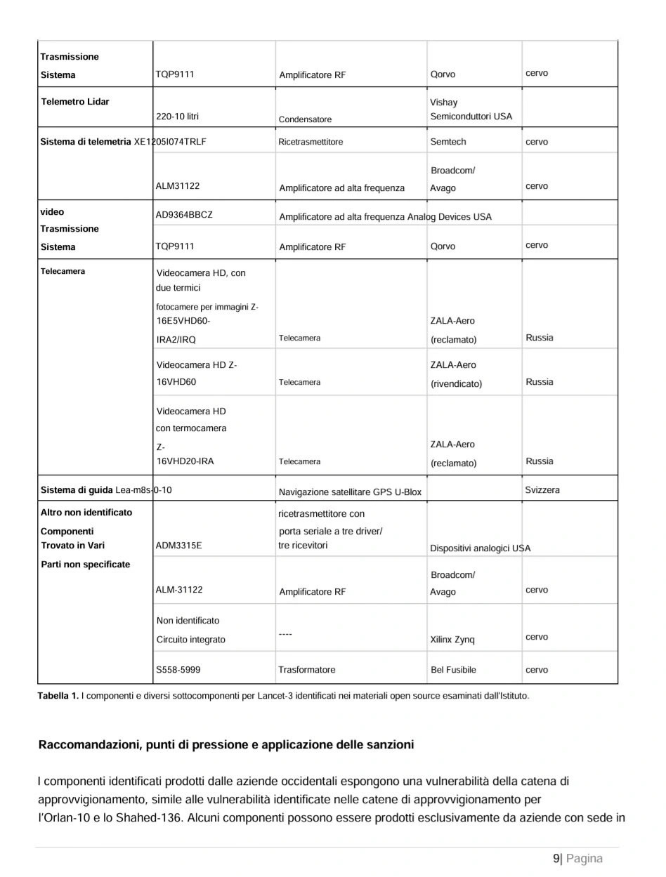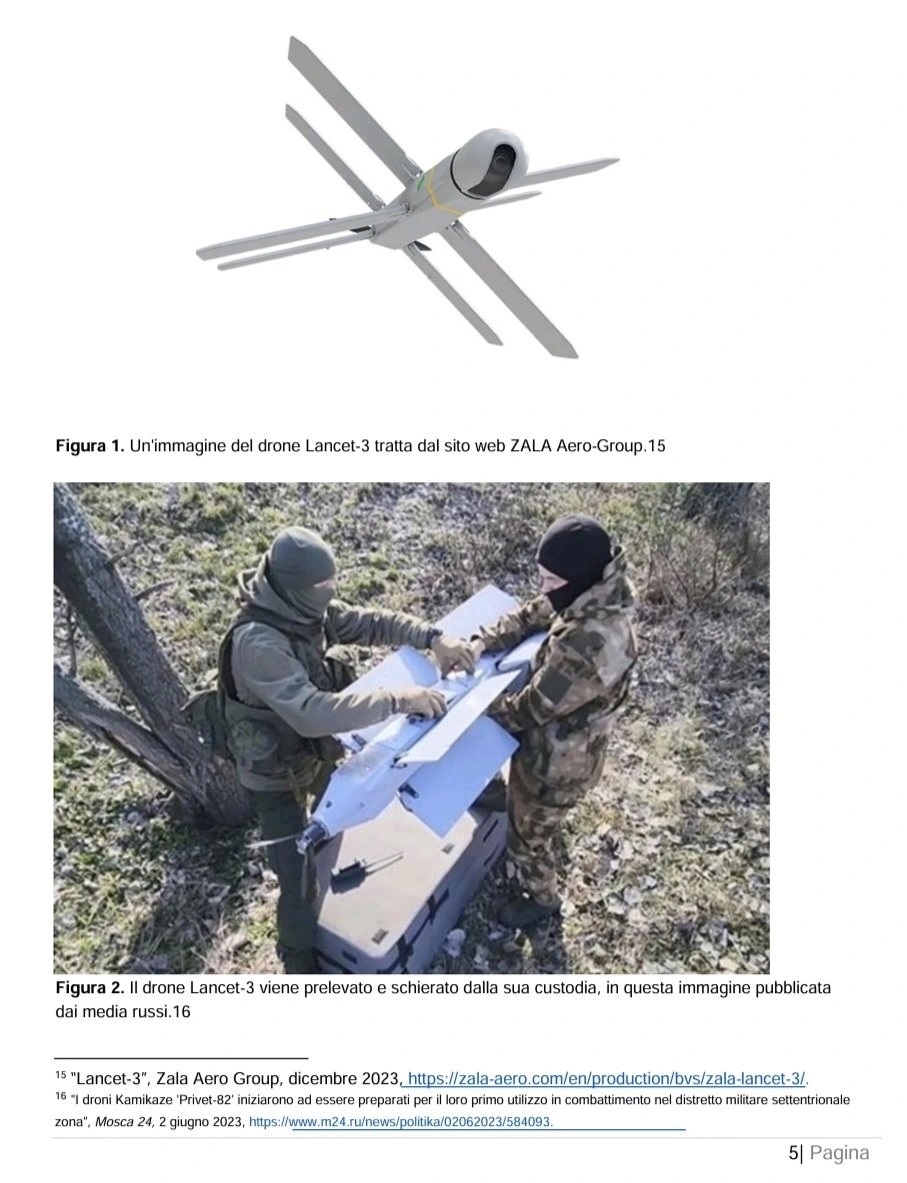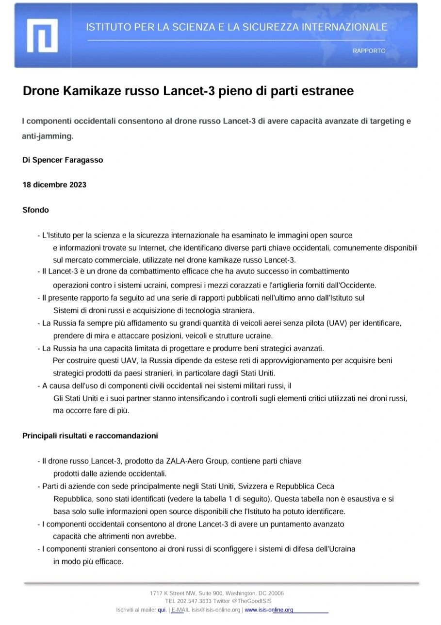 Sul rapporto si legge quanto segue: «La Russia fa sempre più affidamento su grandi quantità di veicoli aerei senza pilota (UAV) per identificare, colpire e attaccare posizioni, veicoli e strutture ucraine. La Russia ha una capacità limitata di progettare e produrre materie prime strategiche avanzate. Per costruire questi UAV, la Russia dipende da ampie reti di approvvigionamento occidentali per acquisire materie prime strategiche prodotte da paesi stranieri, in particolare dagli Stati Uniti…Il drone russo Lancet-3, prodotto da ZALA-Aero Group, contiene componenti chiave prodotte da aziende occidentali. Sono state identificate parti di aziende con sede principalmente negli Stati Uniti, in Svizzera e nella Repubblica Ceca… I componenti occidentali consentono al drone Lancet-3 di avere capacità di puntamento avanzate che altrimenti non avrebbe. Grazie ai componenti stranieri, i droni russi riescono a sconfiggere più efficacemente i sistemi di difesa ucraini… Le immagini disponibili di un motore trovato nel Lancet-3 mostrano che si tratta di un motore elettrico prodotto dalla società ceca AXI Model Motors, il brushless AXI 5330 Gold Line… La Russia ha compiuto uno sforzo concertato per mascherare l’uso di questo motore e in alcune immagini disponibili, il logo AXI è coperto con nastro adesivo il Lancet-3 ha capacità di intelligenza artificiale (IA) che consentono un’elaborazione avanzata di immagini e dati per l’acquisizione del bersaglio. Una decostruzione di un drone Lancet ha scoperto che è dotato del Jetson TX2, un modulo di sviluppo IA avanzato e compatto prodotto dalla società americana NVIDIA.» (22)