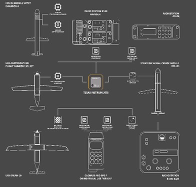 Leggendo il documento si apprendono informazioni di grande importanza: «Un esame dei sistemi d’arma russi utilizzati in Ucraina ha rivelato che contengono grandi volumi di componenti microelettronici di fabbricazione straniera…RUSI ha identificato almeno 450 componenti microelettronici unici all’interno di questi armamenti, prodotti da aziende con sede negli Stati Uniti, in Europa e nell’Asia orientale. Degli oltre 450 componenti trovati da RUSI nei sistemi militari russi, almeno 318 sono stati realizzati da aziende statunitensi. Componenti provenienti da Giappone, Taiwan, Svizzera, Paesi Bassi, Germania, Cina, Corea del Sud, Regno Unito, Austria e altri erano presenti anche nelle apparecchiature esaminate dal gruppo di ricerca… Componenti apparentemente prodotti dalla Texas Instruments sono stati scoperti nel drone ‘kamikaze’ KUB-BLA, in un drone bersaglio E95M, in un drone Orlan-10 e in diversi apparecchi radio utilizzati dall’esercito russo.» (16)